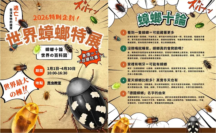 園方表示,這次特展將展出多種「不會飛」的蟑螂,部分品種還會發出聲響,其中包含相當知名的馬達加斯加蟑螂。更特別的是,展覽期間規劃互動體驗,民眾可透過事前預約,近距離「親手觸摸」馬達加斯加蟑螂,實際感受牠們的外型與生命力,成為展覽最大亮點之一。