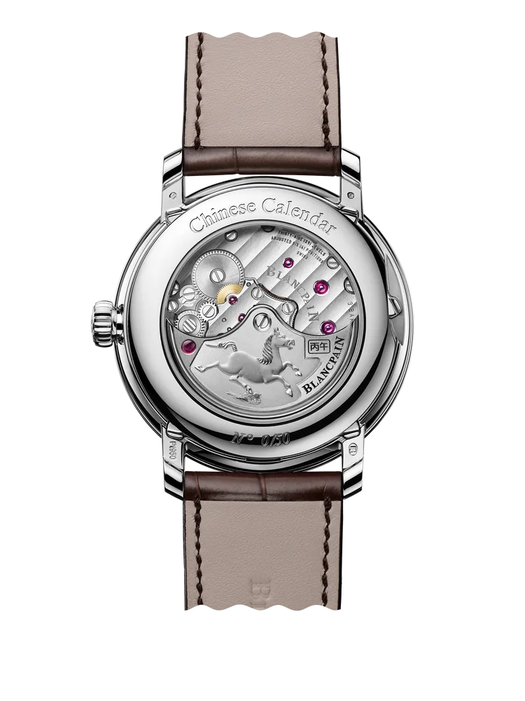 錶背同樣蘊藏匠心,22K金手工雕刻的自動盤描繪駿馬凌空疾馳的姿態,取意傳說中的天馬意象,並與鑲嵌其中的天然紅寶石及「丙午」漢字相互呼應,映照火馬年所象徵的能量與躍動。