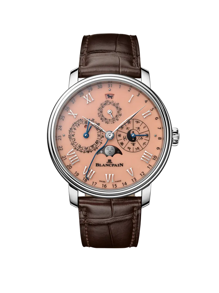 Blancpain Villeret系列全新作品在視覺上展現鮮明突破,首次引入溫潤而醒目的「鮭魚紅」大明火琺瑯面盤,色澤隨光線流轉,層次細膩。錶盤配置講究而清晰,12 點鐘位置標示時辰與生肖,3 點鐘位置呈現五行與陰陽變化,農曆月份與日期則安置於9點鐘位置,整體布局在複雜資訊中仍保有從容節奏。