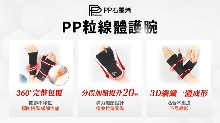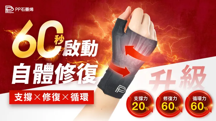 有別於市售護腕僅能死板支撐,PP 石墨烯粒線體護腕從「使用中穩定、使用後恢復」重新定義防護。360 度包覆結合分段式加壓,比一般護腕提升 20% 的穩定力,能精準分散壓力、杜絕位移拉傷。透過 3D 立體一體成形技術,徹底解決長戴壓迫與變形問題,讓靈活度與耐用性達到頂尖平衡。最核心的差異,在於結合「石墨烯 × 粒線體」機能纖維,在強力撐托的同時,主動導引能量循環,協助手腕排除深層疲勞。最後輔以人體工學長綁帶與無聲自黏技術,實現精準控壓,即便長時間高強度使用,依然維持絕對乾爽舒適。