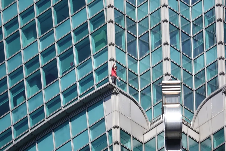 挑戰過程中,艾力克斯先以約16分半完成難度較低的基座區1到25層,過程中還向現場粉絲揮手致意。進入26層後的竹節區,結構複雜、難度明顯提升,他每一步都格外謹慎,在開爬約30分鐘後完成3個竹節區,順利攻下一半高度,最終穩定發揮,成功抵達觀景台,讓現場觀景台內的民眾都為他喝采。