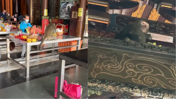 雖然廟方已做了這些宣導與預警,但日前竟真的出現了搗蛋的現行犯。一名獼猴光天化日之下闖入廟內,看準供桌上整籃的供品,猛力一躍跳上桌,瞄準整串香蕉一口叼起。由於猴子動作粗魯,在奪取香蕉的同時也把籃子掀翻,導致籃內的橘子、檸檬等供品瞬間灑落一地。這隻猴子接著在供桌之間靈巧跳躍,隨即沿著廟內龍柱迅速爬到高處橫樑。