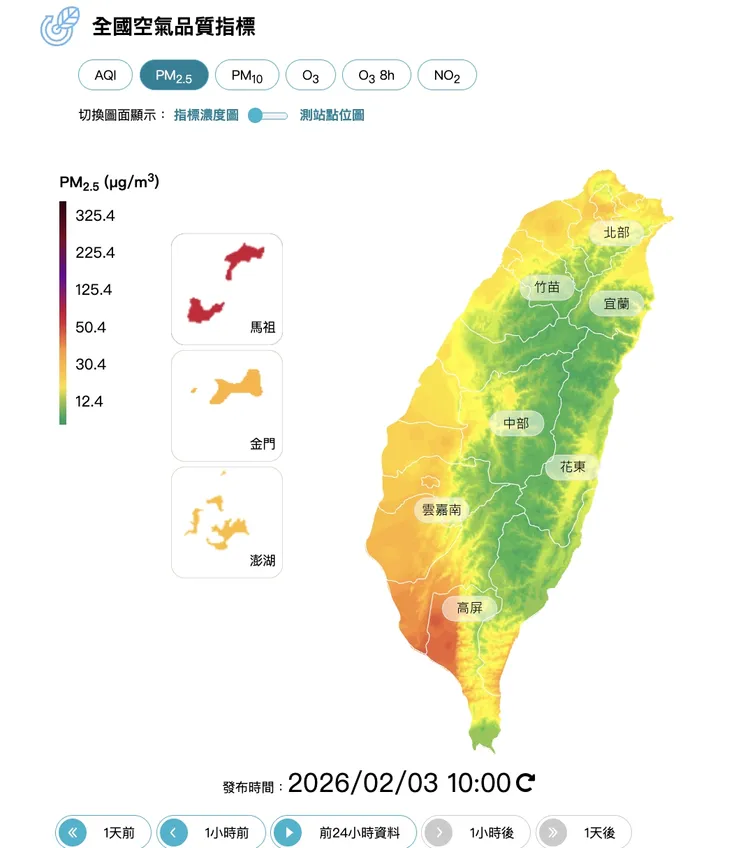 環境部說明,中國上海到山東一帶日前PM2.5小時濃度約70至180微克/立方公尺,污染物持續累積,隨著大陸冷氣團南下,境外污染物昨日起陸續移入台灣。北部地區PM2.5小時濃度一度達30至50微克/立方公尺,全台空氣品質落在普通到橘色提醒等級。隨著東北風推動,污染物今日午後將逐步往南移動。