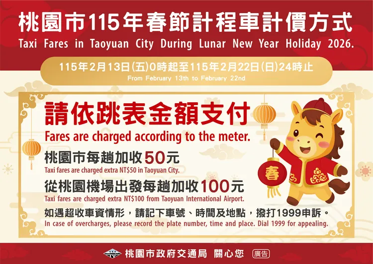 今年的春節連續假期計程車加收運價實施期間,自115年2月13日(周五)0時至115年2月22日(周日)24時止,共計10日。實施期間桃園市計程車比照往年按每趟次加收50元;桃園國際機場排班計程車每趟次加收100元。計程車駕駛人依計費錶功能選取計入春節加成,依計費表顯示金額向乘客收費。民眾乘車時間如果跨至加成運價時段,統一以「上車時間」為準,例如:上車時間為2月12日23時30分,下車時間為2月13日凌晨1時,仍應依原價收費,不得加價。