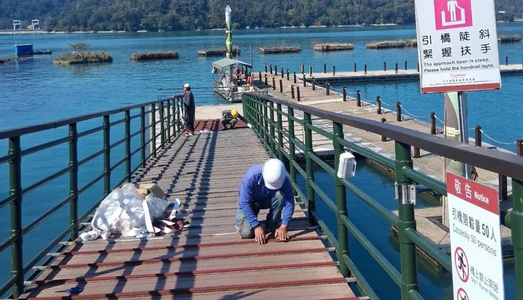 日管處說,由於水位下降導致碼頭引橋傾斜度增加,為避免遊客因橋面濕滑或坡度過大發生意外,目前正於四大碼頭實施面潭左側引橋全面裝設防滑設施,增加踏步摩擦力,提供遊客更穩固的行走環境;而考量防滑設施不利輪椅族、推車及行動不便者使用,面潭右側引橋仍維持原有斜坡道設計,並將由現場保全人員加強引導與協助,以兼顧通行安全與無障礙需求。