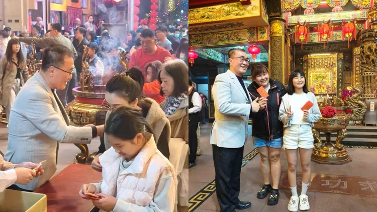 今(17日)適逢大年初一,李四川稍早前往新北市府所在的板橋區,其擁有267年歷史的板橋埔墘福德宮參拜,提早為馬年選戰暖身做準備!李四川現場發送1000多個紅包,民眾也相當熱情排隊等待領取發財金。