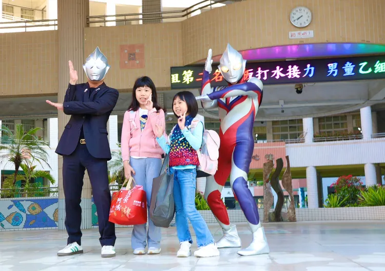 今天是寒假結束後的開學日,新上國小學生們一早上學前,發現校門口出現一位熟悉又令人驚喜的身影,校長王彥嵓與老師們化身「超人力霸王」,身穿紅銀相間的英雄裝扮,站在校門前熱情迎接每一位返校的孩子。
