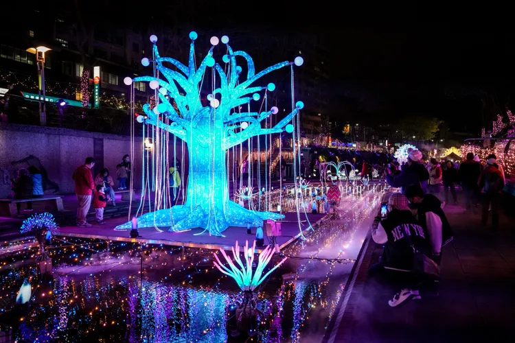 其中最吸睛的亮點,莫過於自信橋下高達7公尺的立體裝置「星耀之樹」,巨型樹燈在星河燈海中綻放光芒,象徵中港大排生生不息的生命力,宛如走進光與星辰交織的奇幻世界,也成為民眾拍照打卡的新地標。
