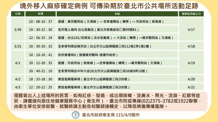 衛生局公布此個案活動足跡,包含3月30日搭乘捷運萬芳醫院站至市政府站、台北101/世貿站至萬芳醫院站,4月1日搭乘棕6路公車、捷運市政府站至萬芳醫院站等,相關場域都已完成清消,請出入相同場所的民眾自主健康監測18天。