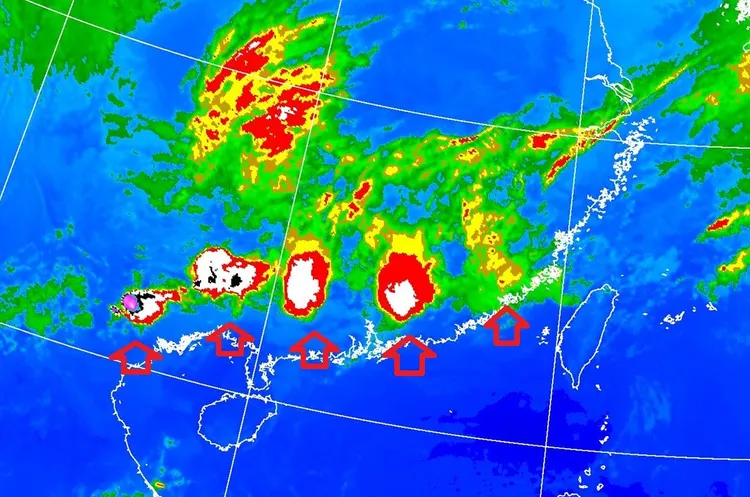 前氣象局長鄭明典觀察指出,目前鋒面雲系出現「排隊的雲團」現象,對流型態由原本帶狀結構,轉為強弱交替的波狀型態。他表示,這種變化代表降雨區開始集中,雖然影響範圍變小,但局部雨勢可能更強。目前雲頂溫度尚未達到較強對流的紫色等級,因此仍屬於雨型轉變初期階段,不過在梅雨季時,類似的列隊式雲團往往是致災性豪雨的特徵之一。