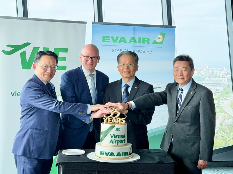 長榮航空開航桃園機場直飛維也納航線滿35週年,維也納機場特別於奧地利時間(16日)於全歐洲最高塔台舉辦慶祝活動,由維也納機場共同執行長Mr.Julian Jäger(朱利安耶格)親自率領高層出席,還可眺望當日長榮航空BR66航班後起飛的畫面。