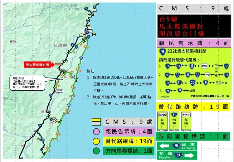 縣府表示,光復鄉及鳳林鎮交界處將舉行堰塞湖災害防救演練,針對「馬太鞍溪便橋」實施全線封閉管制,建議北上與南下民眾依替代路徑繞行避開管制區,北往南下路線從鳳林鎮改走193縣道至光復大農大富後接回台9線;南往北上路線則建議走台11線,或從台9線光復大農大富轉193縣道後續行到花蓮市。