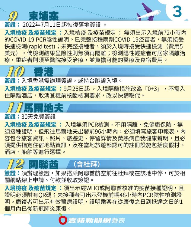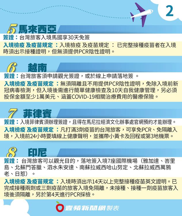 凡打滿3劑疫苗的台灣旅客,可享免PCR、免隔離入境,入境前24小時要填線上健康聲明,並攜帶小黃卡及回程或第3地機票。入境菲律賓須辦理簽證,且得在馬尼拉經濟文化辦事處官網預約才能辦理。