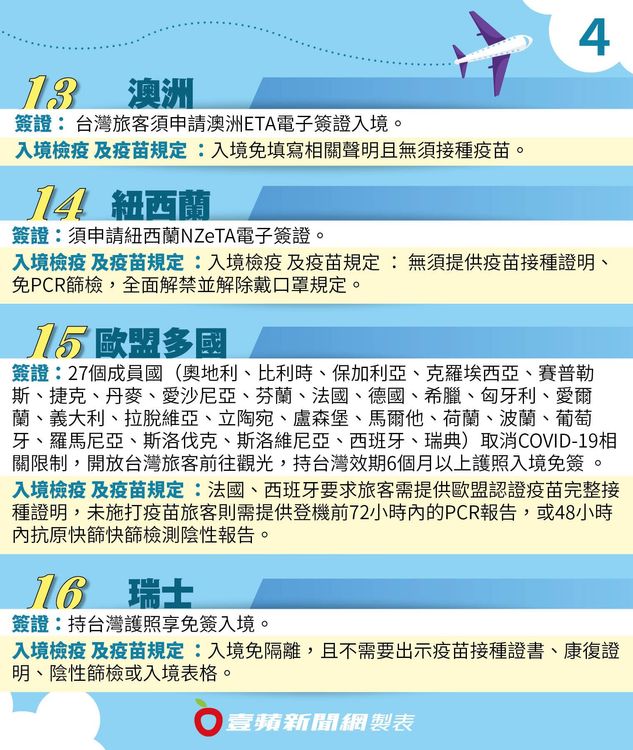 台灣旅客須申請紐西蘭NZeTA電子簽證。入境旅客無須提供疫苗接種證明、免PCR篩檢,全面解禁並解除戴口罩規定。