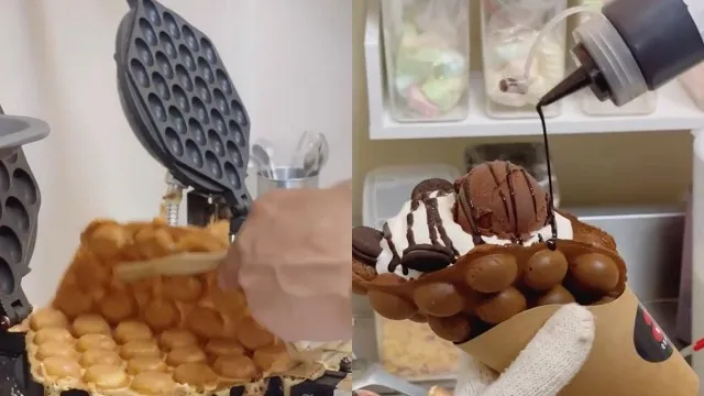 【影音中心】在模型機器上倒上滿滿的麵糊,等雞蛋仔成形後在擠上冰淇淋或是其他配料,最後配上一杯冰美式,完全就是高級的下午茶體驗。精彩內容請看影片。