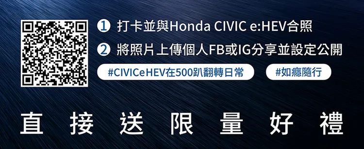 Honda Taiwan號召廣大的Honda車迷朋友,12/1至12/3一起至Honda攤位打卡並與all-new CIVIC e:HEV合照,將照片上傳個人FB或IG公開分享貼文,即可獲得Honda限量好禮(數量有限,送完為止)。另外為讓喜愛Honda的網友一同共襄盛舉,Honda Taiwan FB官方粉絲團加碼舉辦線上留言抽all-new CIVIC e:HEV限量襯衫活動。Honda Taiwan敬邀車迷朋友走進《500趴》,一同近距離體驗all-new CIVIC e:HEV日製歐規性能車的精湛工藝。