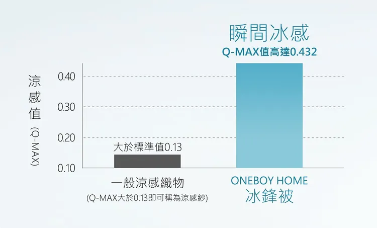 ONEBOY HOME的冰鋒被本身產品力也真的很強大,因為光是Q-MAX值就達史上最涼0.432(數值越大布料越涼爽、吸熱越快)。一般只要高於0.13就能被稱為「涼感」,大於0.2摸起來就可感受到微微涼爽,大於0.3則是明顯感覺有點涼,而冰鋒被的0.432光接觸就能瞬間減少5度,再加上冰感科技超細纖維,柔柔軟軟摸起來很細緻很親膚;也難怪許多消費者體驗後,會再回購好幾條分送親友,總歸一句話,今年夏天「無論如何,蓋冰鋒被」就對了!