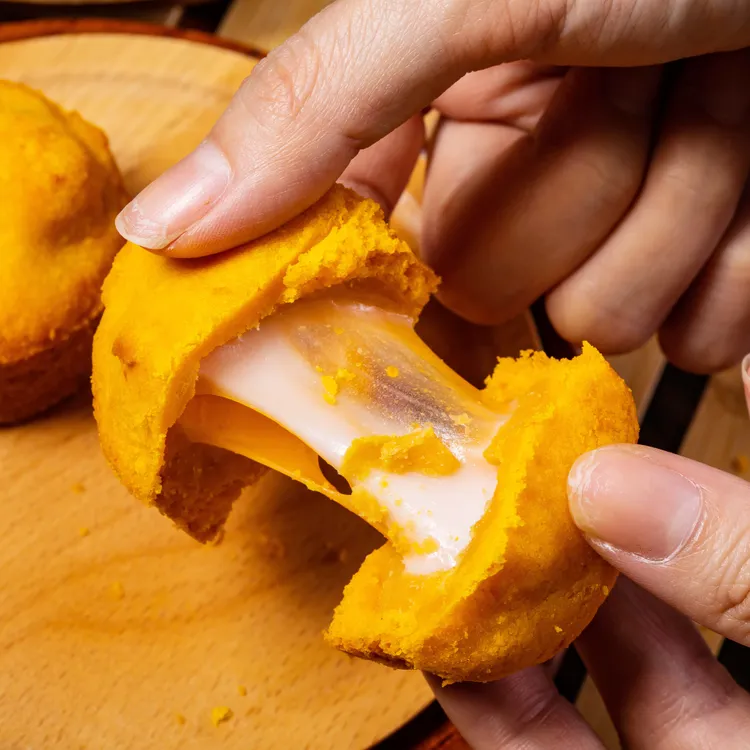 鬆軟外皮搭配Q彈的麻糬,再加上濃郁流心芝士的「爆漿芝士麻吉餅」6入市價432元,預購價410元。選用美國進口帕瑪森起司及日本製麵粉等高級原料製成,酥嫩鬆軟外皮奢侈的添加起司粉,打造多層次起士風味。QQ麻糬尬起司,雙重內餡一次滿足,輕咬一口爆漿芝士緩緩流出,鹹香滋味恰到好處,讓人一吃就著迷不已,念念不忘。