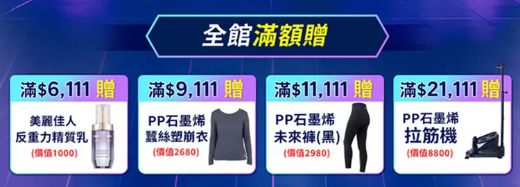 官網滿NT$6,111贈法國美麗佳人反重力精質乳、滿NT$9,111贈PP石墨烯蠶絲塑崩衣、滿NT$11,111贈PP石墨烯未來褲;如果想要一次購足全家人衣著用品,建議挑戰最高等級滿NT$21,111贈PP石墨烯拉筋機(價值NT$8,800),俗話說「筋長一吋、多活十年」,這一台真的很值得擁有呢!