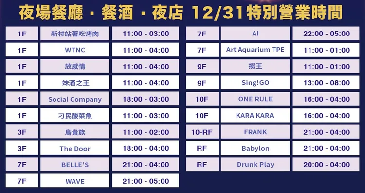 除了DJ連夜接力精采表演,ATT館內部分餐廳及夜店也將延長營業至凌晨4點,民眾欣賞完跨年煙火即可就近再續攤,ONE RULE、WAVE CLUB、Ai、Babylon、FRANK、Drunk Play等也各自推出跨年限定活動,攜手打造ATT娛樂王國不夜城名號,要給年輕朋友紛繽燦爛並難忘的跨年夜!