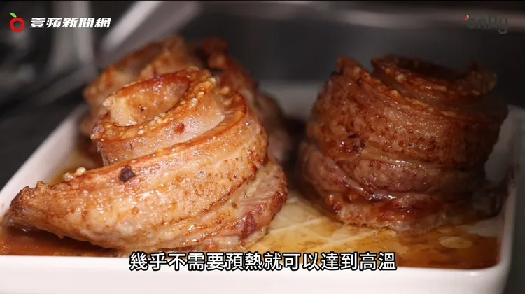 而能把五花肉作做得酥脆好吃的關鍵就是:一般旋風烤箱都是加熱管與風扇分開放,邊循環邊加熱箱內的冷空氣,升溫慢預熱時間長,料理很費時!而這台是真正「氣炸式」設計,加熱管與風扇放在一起,通過強大的風扇將加熱過的空氣直接均勻地吹向食物。這樣的設計可以將食材快速加熱,且幾乎不需預熱就可達到高溫,也難怪做出來脆皮五花肉跟夜市賣得一模一樣,超脆超好吃,在家也可以實現五花肉自由啦~