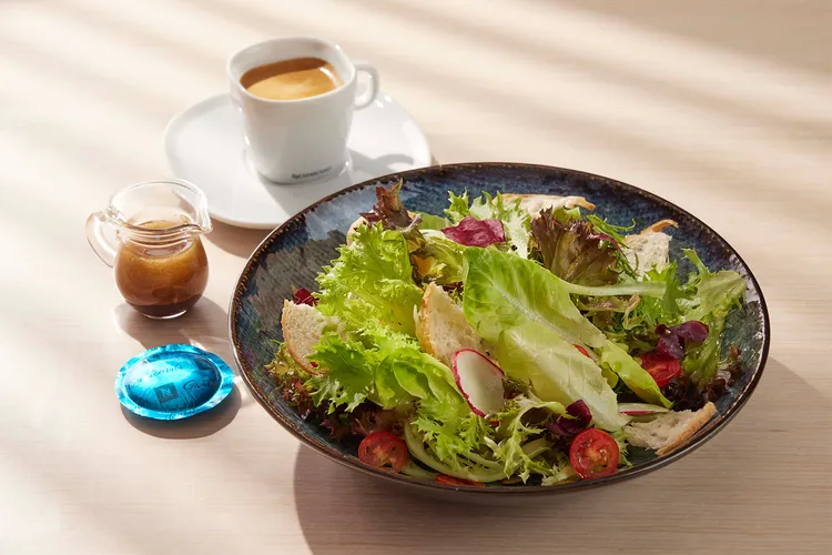 林泉主廚靈活運用 Nespresso 多元風味膠囊,融合台灣在地、國際都會城市概念的食材,精心打造五道晨食創作—從沙拉、輕食到富有創意的台味料理,巧妙展現咖啡與料理之間的風味交織與感官呼應。晨焙咖啡油醋沙拉將咖啡香氣融入油醋醬,與生菜、堅果形成平衡層次,主廚在這款風味沙拉醬特別選用「單一產區臻選—瓜地馬拉(Guatemala)」,此款咖啡混合阿拉比卡與羅布斯塔豆,散發麥芽、穀物與微焙香氣,與雪莉酒醋的堅果與乾果調性完美契合,葡萄籽油則細膩地串聯起整體香氣,讓口感更平衡、清爽,感受咖啡彷彿內斂卻豐富的香氣特質,適合獻給喜歡輕盈飲食開啟清晨的旅人。