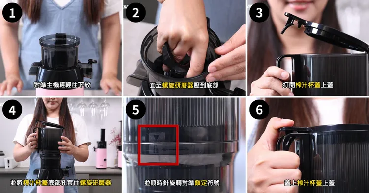 最後只要將「果汁杯」對準「出汁口」、「果渣杯」對準「出渣口」,就完成組裝啦!