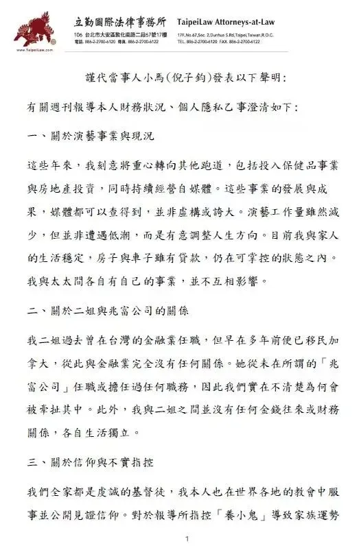 有關週刊報導本人財務狀況、個人隱私乙事澄清如下: