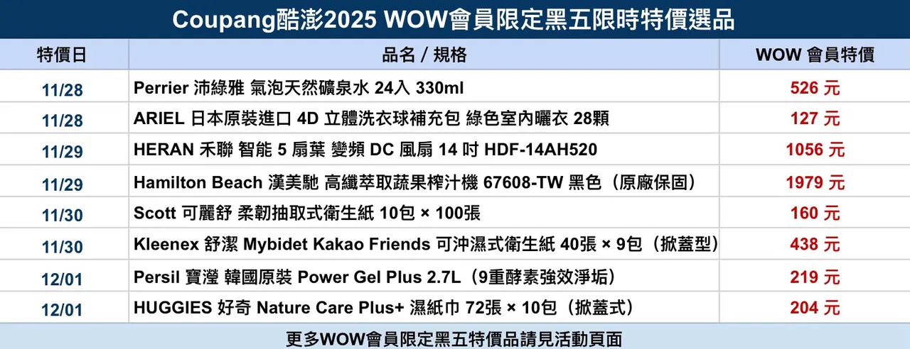 Coupang 酷澎台灣憑藉在母嬰品類的長期深耕與顧客高度回購力,持續以紙尿布等主力商品及優選母嬰用品展現全球商務優勢,為廣大顧客引進更多元、可信賴的精選好物。進一步擴大至全家日常所需,Coupang酷澎也在本次黑色星期五期間為 WOW 會員推出母嬰到居家清潔等多品類的專屬優惠,回饋會員採買需求。WOW會員11月28日到12月1日黑色星期五活動頁面天天享專屬優惠,搭配「火箭速配」最快隔日到貨,法國原裝進口perrier 沛綠雅氣泡天然礦泉水、ARIEL日本原裝進口4D立體洗衣球補充包、Kleenex舒潔可沖濕式衛生紙等數十樣必收好物,每日0點更新,鎖定Coupang酷澎app限量開賣!