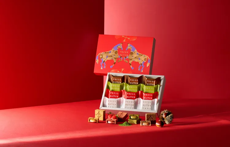 2026年PRESS BUTTER SAND推出的「貳馬賀新春」 12入禮盒,將象徵吉祥與成功的駿馬作為主軸,以喜氣山茶花紅與金色光芒描繪新春意象,融入日本侍奉神馬祈願的文化,將幸福祝福注入焦糖奶油夾心餅乾中;馬年賀歲禮盒臻選最受歡迎的4種風味:經典原味、甘王草莓、宇治抹茶與秋栗焦糖奶油夾心餅乾。