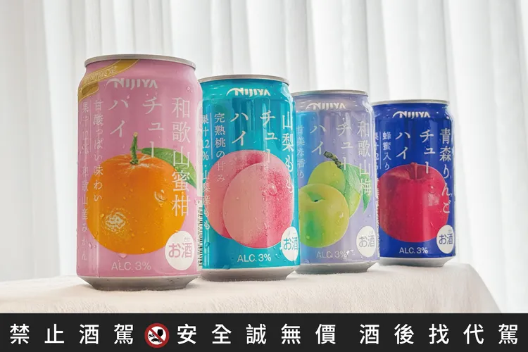 現行販售的「青森蘋果蜂蜜」、「山梨水蜜桃」與「和歌山梅子」為NIJIYA長期熱銷款式。其中,青森蘋果蜂蜜調酒選用青森縣國產蘋果汁,果汁含量達12%,搭配蜂蜜調性,口感圓潤;山梨水蜜桃同樣以12%果汁比例呈現完熟桃果的甜美香氣;和歌山梅子則以10%梅子果汁帶出清爽微酸的平衡感,適合搭餐飲用。