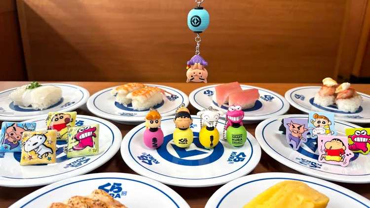「蠟筆小新公仔吊飾」系列巧妙融入藏壽司經典KURA燈籠元素,小新以招牌露屁屁姿勢俏皮登場,小葵首度加入公仔陣容,呆萌站上粉紅燈籠,療癒指數瞬間爆表;肥嘟嘟左衛門則以倒立姿態搞怪亮相,每一款都精準擊中粉絲收藏慾。同步推出的「磁鐵書籤」與「動感吊飾」系列,捕捉角色誇張又逗趣的瞬間表情,不論是小葵騎著小白暴走,或小新舞動般的歡樂姿態,都讓人忍不住想全套入手。