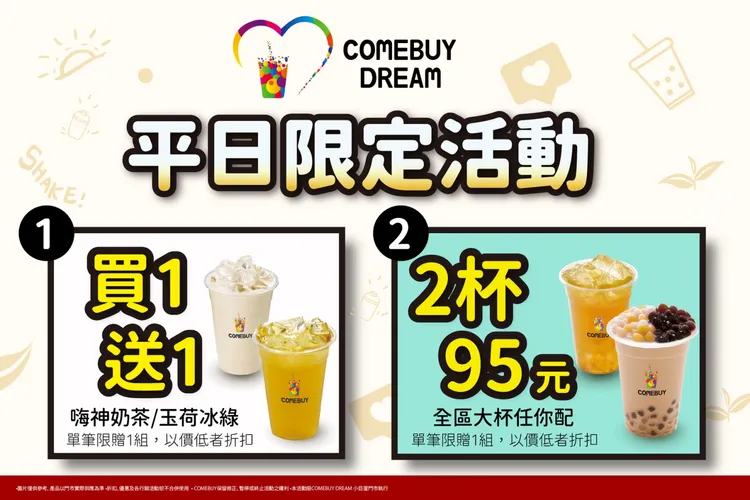 第三波開運抽好禮由官方社群接棒,活動時間為2/25至3/10。消費者只要依活動辦法參與互動並完成指定任務,即有機會抽中50元VIP券兩張,共計100名。實際規則與細節,將以官方粉絲專頁公告為準。壓軸登場的開喝愛回饋聚焦公益門市COMEBUY DREAM。該店源自品牌長期推動的「公平就業」理念,歷時一年半,攜手陳重光文教基金會規劃,並由陽光基金會專業社工及學員參與建置,以「心障礙工作流程」與「硬體全面客製化」為核心,打造全台具代表性的共融型手搖飲門市。店內服務人員以「天使調茶師」身分站上第一線,目前門市位於台北小巨蛋一樓。即日起至3/6平日再加碼大杯任選2杯95元組合,單筆限購一組,實際品項依現場公告為主。