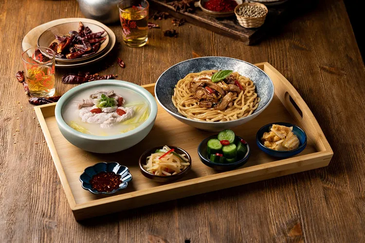 除了麵食,阿達師也重現台灣厚工湯品與辦桌手路菜。「胡椒豬肚雞湯」以白胡椒點綴Q彈豬肚與鮮嫩雞肉,乳白湯頭辛香溫潤;「當歸薑絲羊肉湯」結合當歸與薑絲辛香,湯頭清甜順口,是初春暖心補氣首選。「辦桌白菜滷」以慢火細燉白菜、炸豬皮與芋頭絲等配料入味,每一口都是古早味的溫暖記憶。