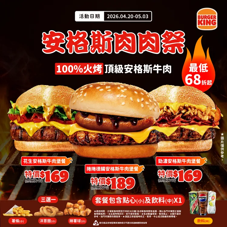 本次活動主打安格斯牛肉系列套餐169元起,包含期間限定新品「捲捲德腸安格斯牛肉堡」,結合德式香腸與厚切安格斯牛排,透過370度火烤工法呈現外香內嫩的口感層次。活動期間凡購買指定漢堡,即可免費升級為套餐,讓消費者在相同預算下獲得更完整的餐點組合。