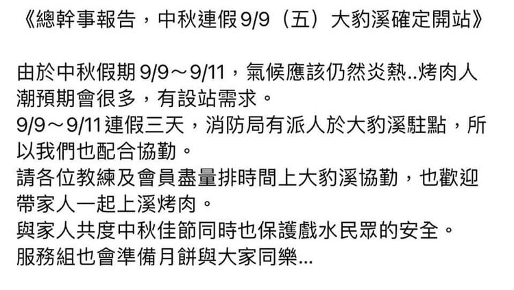 不過也有網友再度分享救難隊員「揪團證據」截圖在社團《靠北登山大小事》中,發文寫道,因為中秋假期預計會有人潮,有設站需求,所以連假三天會在大豹溪設站,「請各位教練及會員盡量排時間上大豹溪協勤,也歡迎帶家人一起上溪烤肉。與家人共度中秋佳節同時也保護戲水民眾的安全。服務組也會準備月餅與大家同樂…」