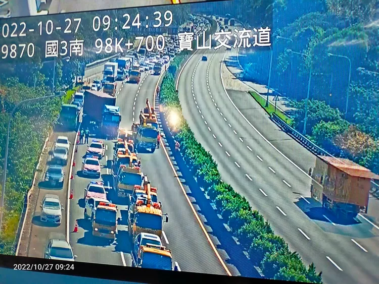 警方指出,這起車禍發生在早上8時15分,33歲莊姓男子駕駛貨櫃車,疑似未保持安全距離,追撞前方9台正在排隊慢速行駛準備下交流道的轎車,整起車禍一度佔用全線車道,南向嚴重回堵3公里;經緊急處理將車輛引導下寶山交流道再上國道後,車流回堵情形已改善,目前事故車輛均已排除,詳細車禍,警方正在釐清中。