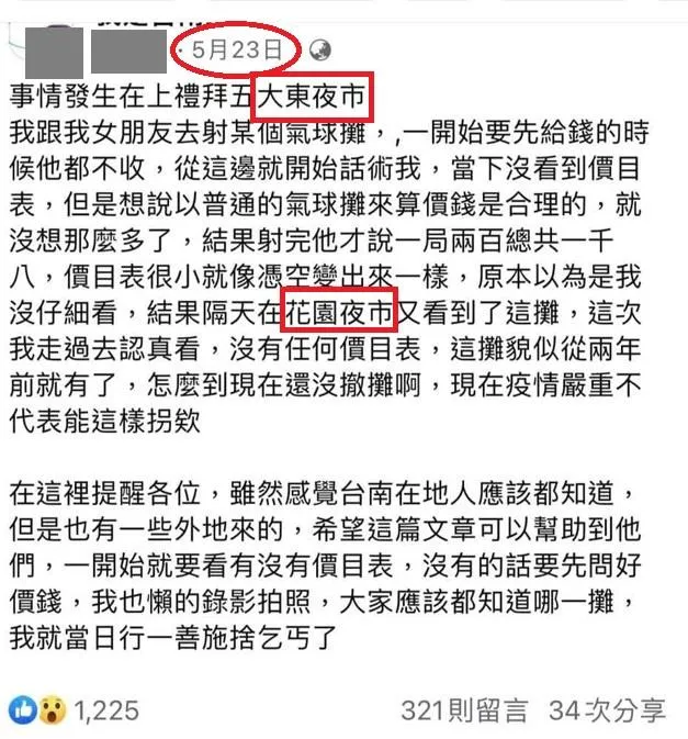 這名女網友在《爆料公社》發文指控,表示她跟男友日前去台南某夜市射氣球,在遊戲過程中店家老闆就不斷干擾客人,要嘛在射氣球時不斷干擾走來走去,害她們差點射中人,還會在射氣球時邊補氣球。