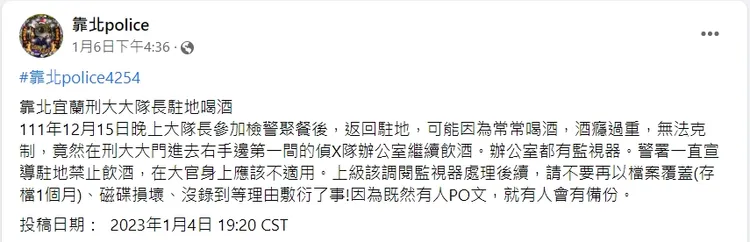 爆料指「辦公室都有監視器。警署一直宣導駐地禁止飲酒,在大官身上應該不適用」。還說「上級該調閱監視器處理後續,請不要再以檔案覆蓋(存檔1個月)、磁碟損壞、沒錄到等理由敷衍了事!因為既然有人PO文,就有人會有備份。」