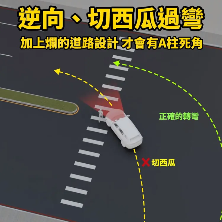 轉彎處、路口車速要減慢,要停讓行人,就算切西瓜,也不至於把人撞死,但這起不幸是直接輾斃,車速是多快啊? 跟A柱根本無關。