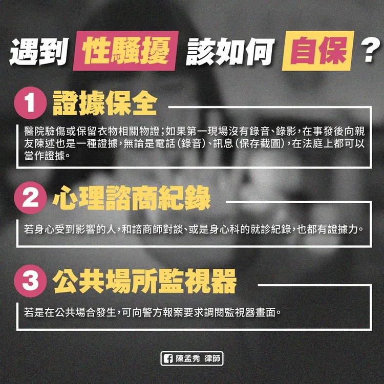 他們敘述中的共通點,都包含了「自責」。陳孟秀指出,雖然面臨性侵或性騷擾的當下,很不容易保全證據,但仍有3招可著手處理。