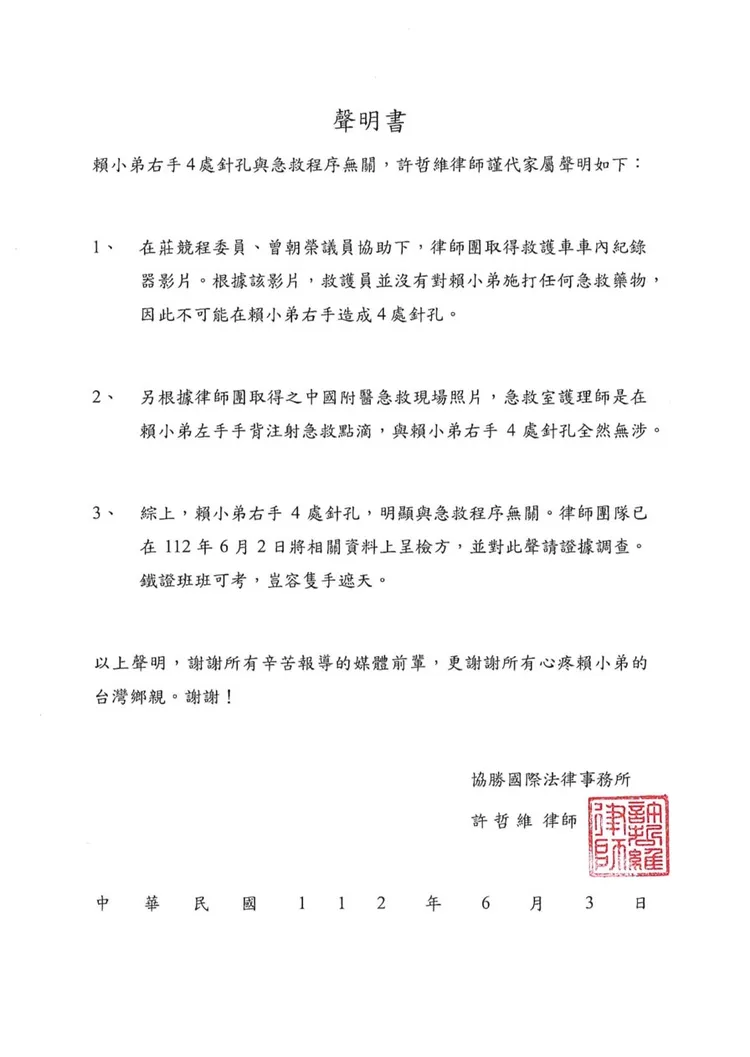 賴小弟右手4處針孔與急救程序無關,許哲維律師謹代家屬聲明如下:
