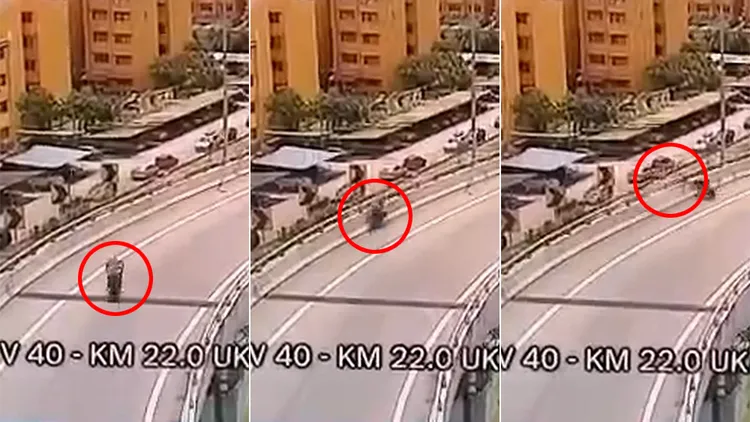 綜合馬來西亞媒體報導,這起事件發生在6日14日下午,60歲騎士當時沿著車道右側行駛,在彎道處卻遭遇迎面駛來的逆向機車,他趕緊將機車左偏閃避,但機車隨即斜向衝往護欄,機車撞擊護欄後將騎士拋飛墜落高架道,車輛則彈回車道中央。而肇禍騎士則逃逸無蹤。