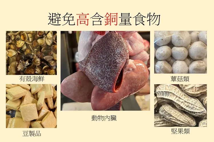 威爾森氏症病友需採取「低銅飲食」,黃錦章表示,大部分的食物均含銅,要避免銅含量高的食物,如內臟類、有殼海鮮、全榖類、核果類、豆類、水果乾、巧克力等,且避免喝酒,以降低對肝臟的損害。