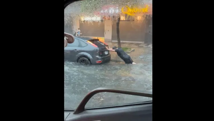 水利署稍早針對北市大同區、中山區等地,發布一級淹水警戒,民眾拍下,大同區重慶北路往國道路段,積水成河,水淹超過半個輪胎,甚至有駕駛下車,冒著暴雨在路中推車,停放路邊機車格的許多機車也半個輪胎泡在水中。