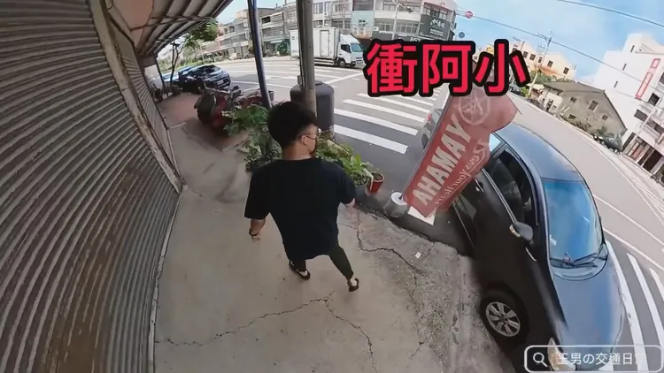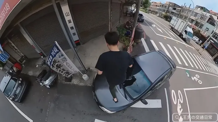 相當關心交通議題的「王男」,5月底曾發布一段影片,畫面中他通過斑馬線走到對街時,一輛違停灰色自小客車直接把整條斑馬線「擋好擋滿」,他完全無法通過,接著「王男」竟直接踩上該車引擎蓋,由左至右順著引擎蓋邊緣踩過去後跳下車,這時車主才反應過來,搖下車窗大罵「衝三小」,王男回頭看了一下後就不再理會,逕行離開。