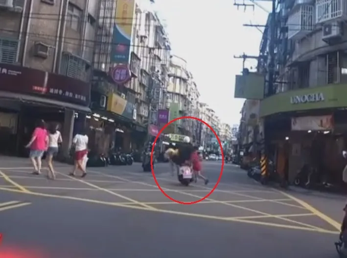 而影片一開頭,汽車行進方向不遠處的路口,騎乘白色機車的黑衣騎士,有疑似一行5名路人,正小跑步要通過路口,但後方2稚齡孩童落後,且汽車同向車道瞬間高速衝出一輛白色機車,剎車不及將奔馳中的2童同時撞飛,較落後的紅衣孩童當場倒地,黃衣孩童卻被撞機車撞個正著高高飛起,噴飛過程中險波及碰撞對向車道的停等機車,接著重摔落地沒了動靜,騎士自身也慘摔犁田。週邊所有路人包括跑在前方的3名大人,急忙衝到倒地不起的2童旁急切查看。