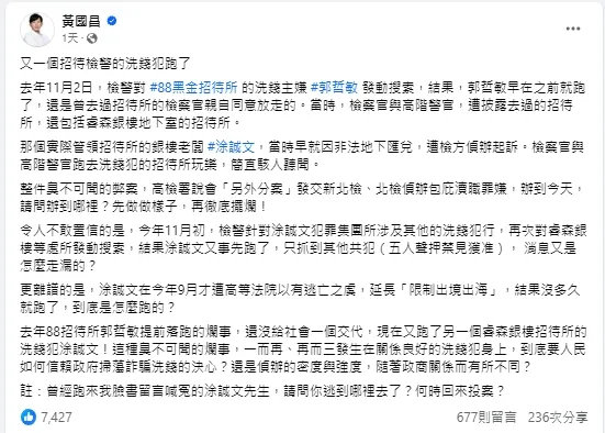 針對涂誠文一案,前立委黃國昌也在臉書開砲,「又一個招待檢警的洗錢犯跑了」,「令人不敢置信的是,今年11月初,檢警針對涂誠文犯罪集團所涉及其他的洗錢犯行,再次對睿森銀樓等處所發動搜索,結果涂誠文又事先跑了,只抓到其他共犯(五人聲押禁見獲准), 消息又是怎麼走漏的?」黃國昌表示,「更離譜的是,涂誠文在今年9月才遭高等法院以有逃亡之虞,延長「限制出境出海」,結果沒多久就跑了,到底是怎麼跑的?」,黃國昌還說,「曾經跑來我臉書留言喊冤的涂誠文先生,請問你逃到哪裡去了?何時回來投案?」