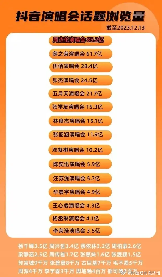 第6至第10名都是大家耳熟能詳的歌手,分別是張學友、林俊杰、張韶涵、鄧紫棋及陳奕迅,靠《浪姐》翻紅的王心凌打入第13名,排行榜中還有一對夫妻檔,楊丞琳及李榮浩分別以4.1億及3.5億,位居第14及第15名。