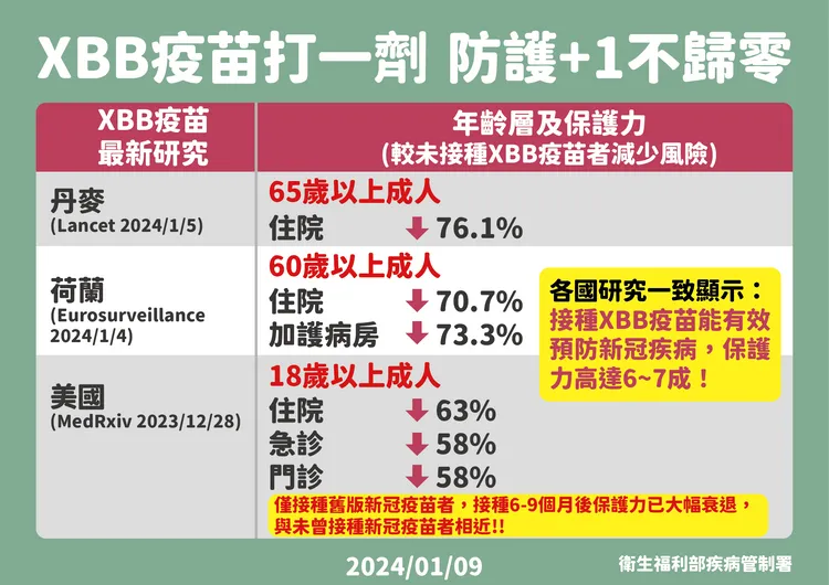 羅一鈞表示,根據丹麥、荷蘭、美國等國新冠XBB疫苗最新研究,一致顯示接種XBB疫苗能有效預防新冠疾病,保護力高達6至7成。過去確診或「舊版」新冠疫苗保護力已嚴重不足,呼籲尚未接種新冠XBB疫苗之民眾在莫德納和Novavax兩種廠牌選擇一種接種,提升免疫保護力。